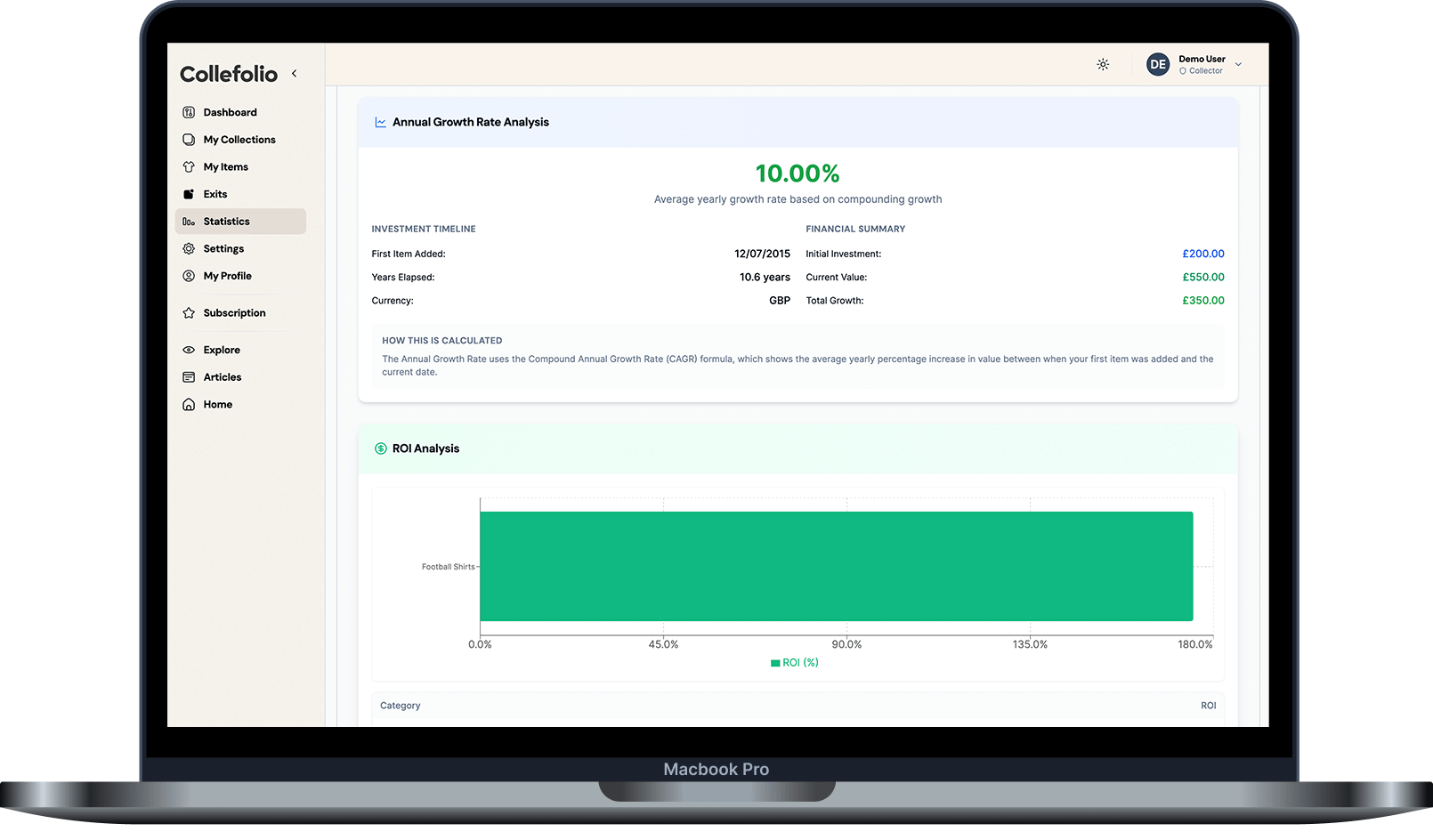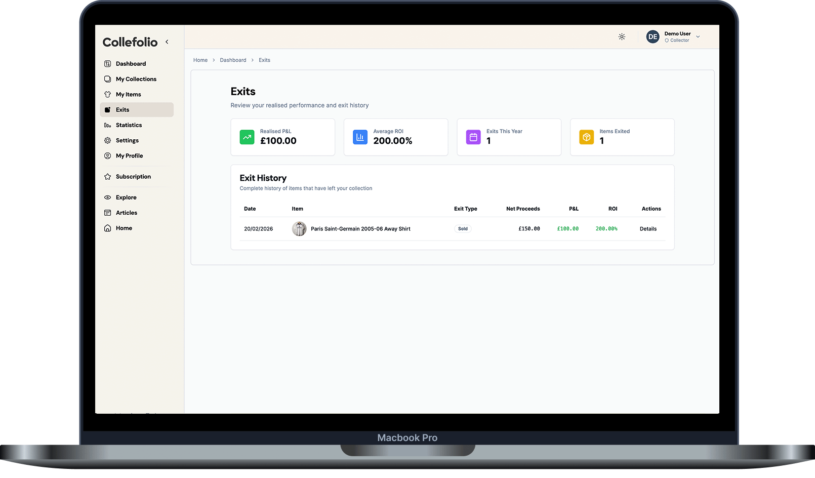 Monitor how your collection’s value changes over time. Calculate gains or losses and review trends to understand which shirts are appreciating and where your best returns lie.